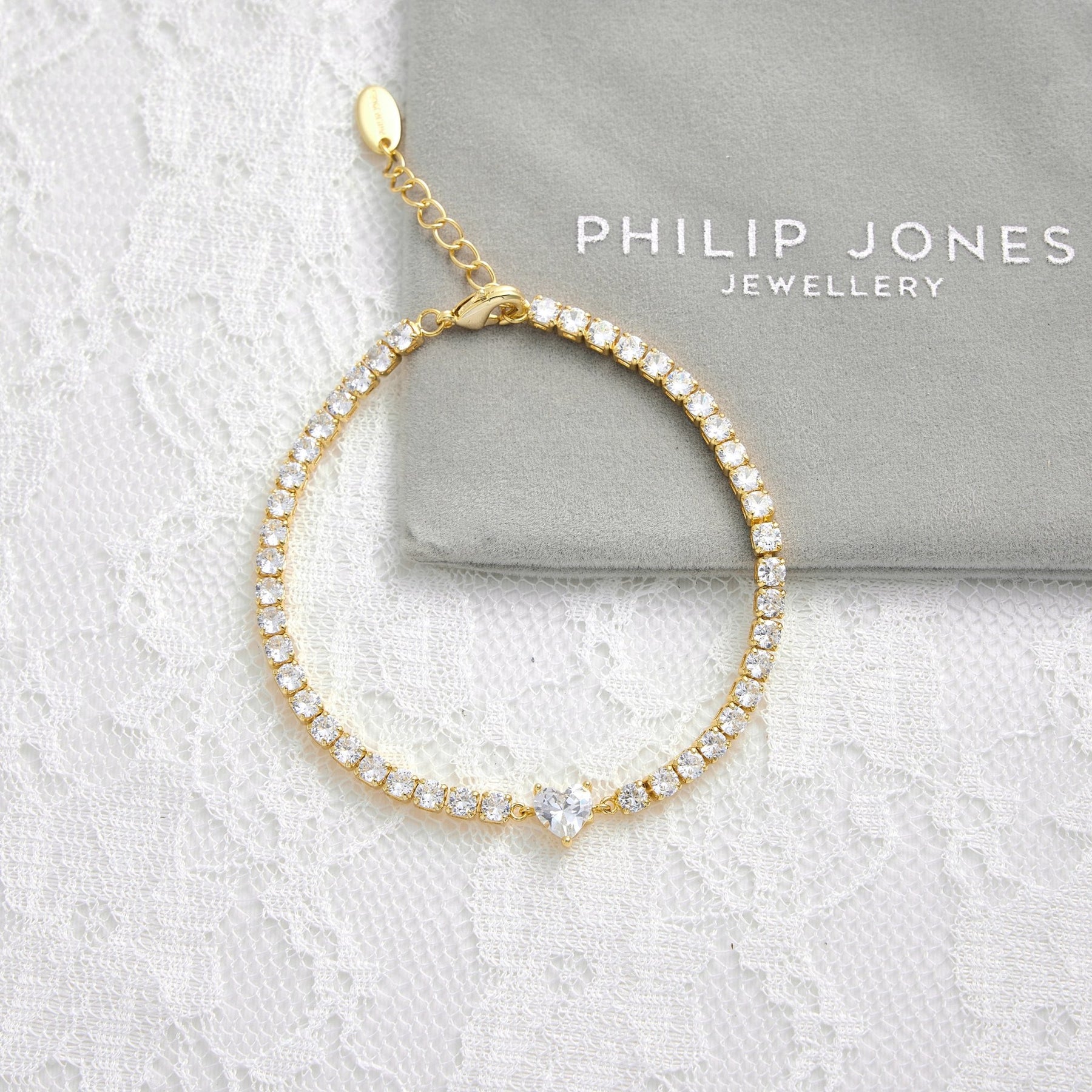 Make a radiant statement on your wedding day with this exquisite gold plated tennis bracelet. Featuring a striking heart solitaire surrounded by sparkling Zircondia® crystals, it's the perfect choice for brides and bridesmaids alike. The hypoallergenic brass alloy ensures all-day comfort, while the adjustable 18cm + 2.5cm design fits beautifully. Arrives gift-ready in an elegant pouch.