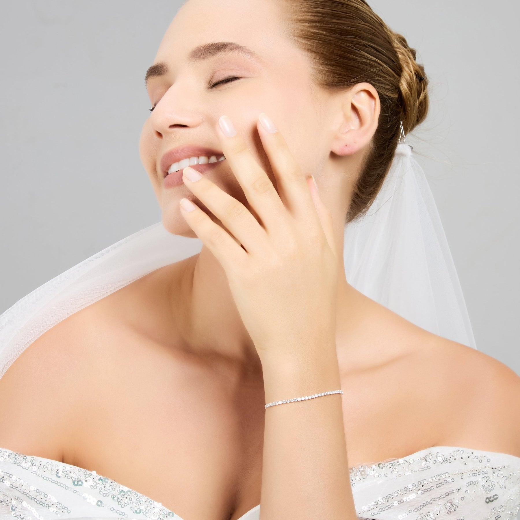 Featuring 35 clear 2mm Zircondia® crystals, this silver-plated tennis bracelet is an elegant choice for brides and bridesmaids. Hypoallergenic and adjustable from 12cm to 24cm with a slider closure, it offers both comfort and style on your wedding day. Crafted by Philip Jones and presented in a gift pouch, this lightweight accessory adds a sparkling finishing touch to any bridal look.