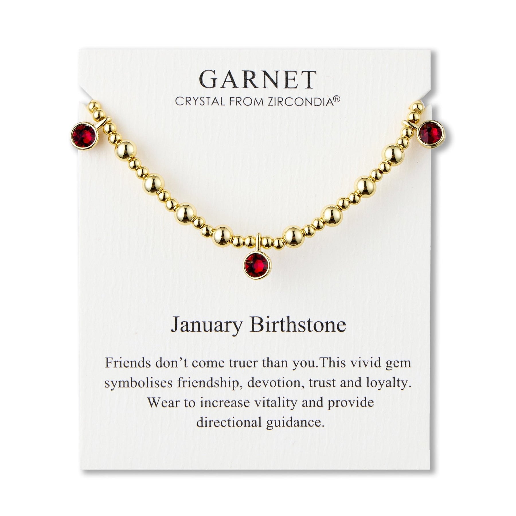 Show your special someone your love and appreciation with the January (Garnet) Birthstone Stretch Charm Bracelet. Made from 18k gold plated brass alloy with three 6mm Hypoallergenic Zircondia® Crystals, this beautiful bracelet will make a perfect gift. With its stretch wrist length, it comes in a quote card for a special surprise.
