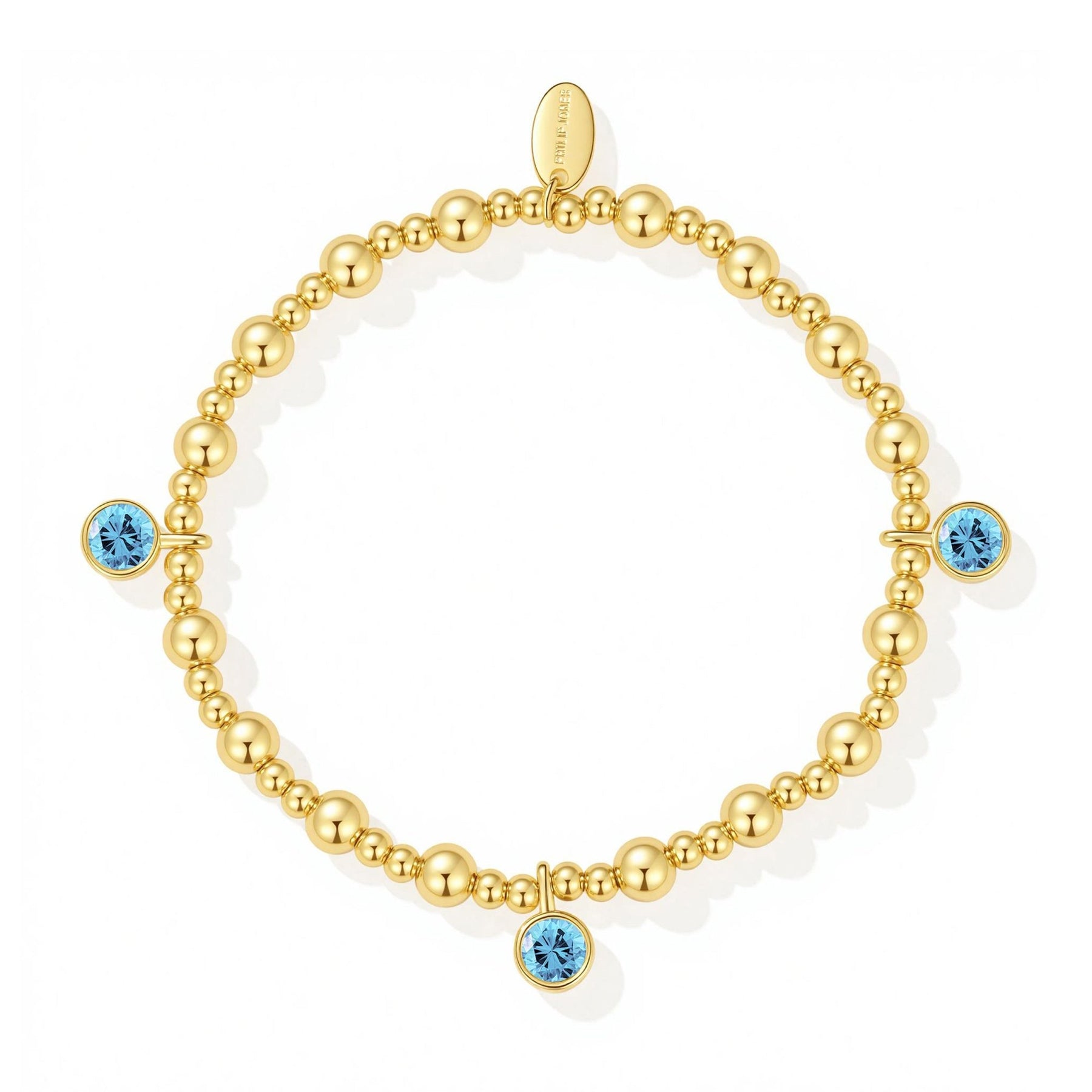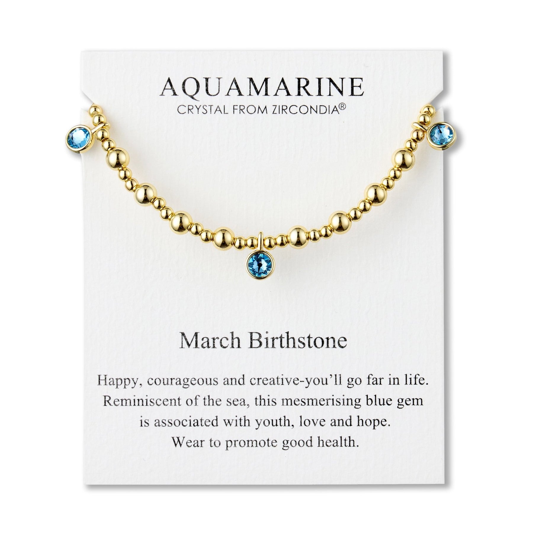 Show your special someone your love and appreciation with the March (Aquamarine) Birthstone Stretch Charm Bracelet. Made from 18k gold plated brass alloy with three 6mm Hypoallergenic Zircondia® Crystals, this beautiful bracelet will make a perfect gift. With its stretch wrist length, it comes in a quote card for a special surprise.