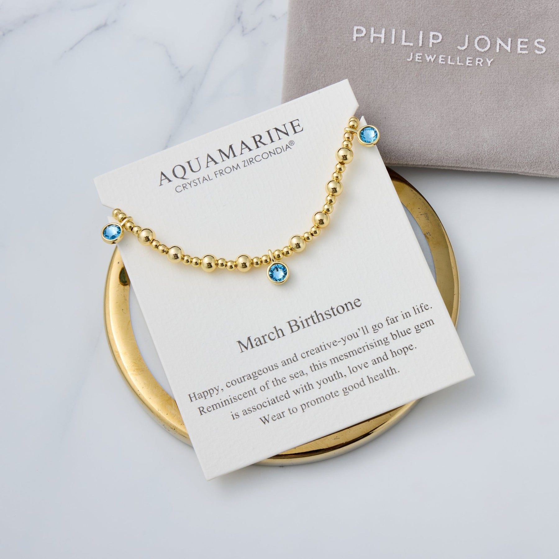 18k Gold Plated March (Aquamarine) Birthstone Stretch Charm Bracelet with Quote Card