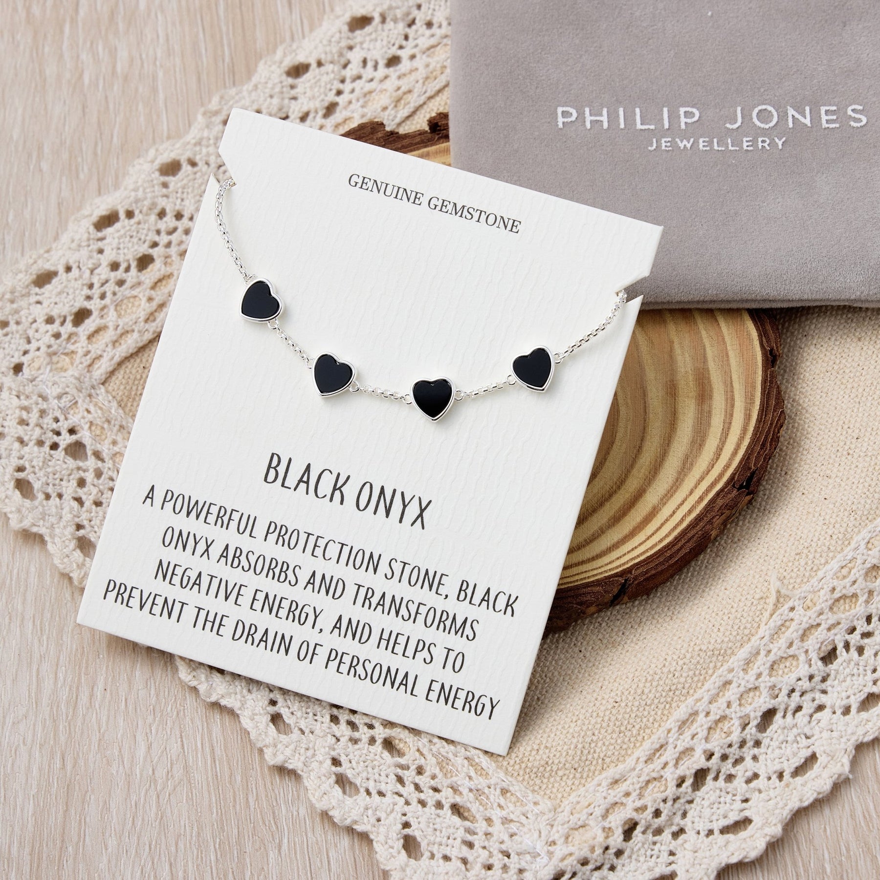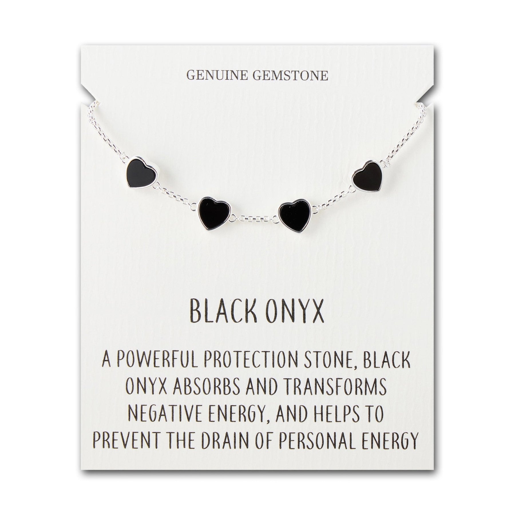 This elegant Black Onyx Gemstone Multi Heart Friendship Bracelet combines genuine black onyx stones with silver-plated brass for a stylish, hypoallergenic accessory. Adjustable from 12cm to 24cm with a convenient slider closure, it offers a perfect fit for any wrist. The delicate 7.5mm heart-shaped stones symbolize friendship and love, making it an ideal gift. Lightweight at just 4.76g and presented in a charming gift pouch, this bracelet is both meaningful and versatile for everyday wear.