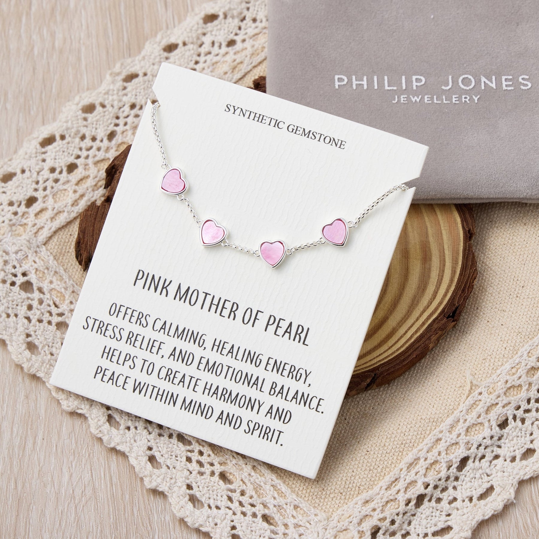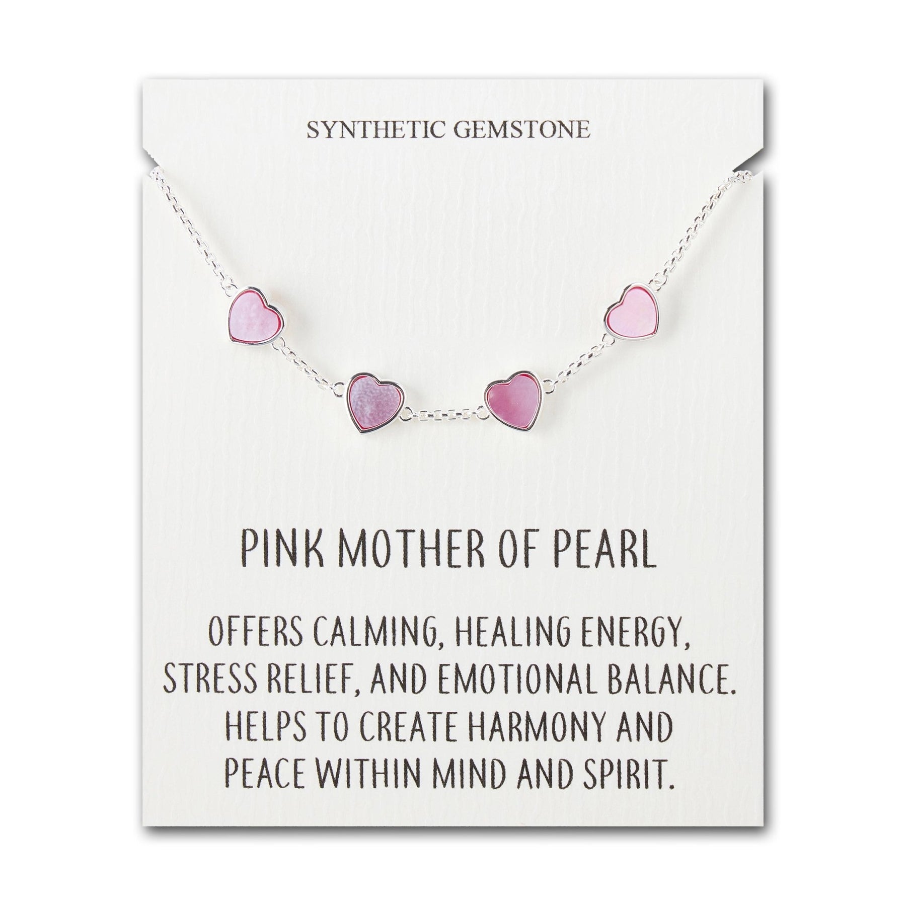This stunning bracelet features pink gemstones and a silver-plated brass alloy base, ensuring both beauty and durability. Pink Mother of Pearl heart-shaped stones add a touch of elegance, while the adjustable slider closure allows for a perfect fit. The bracelet comes in a stylish gift pouch, making it the ideal present for loved ones.