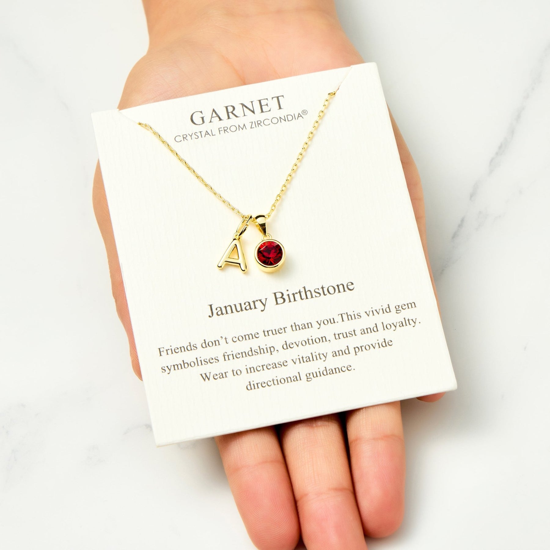 This gold-plated January birthstone necklace features a 7mm round red Zircondia® crystal and a customisable initial charm (A-Z). Made from hypoallergenic brass alloy, it includes a 43cm cable chain with a 5cm extender and lobster claw clasp. The pendant measures 14mm by 8mm and weighs 3.47g. Packaged in a gift pouch with a quote card, it’s a perfect personalised gift choice.
