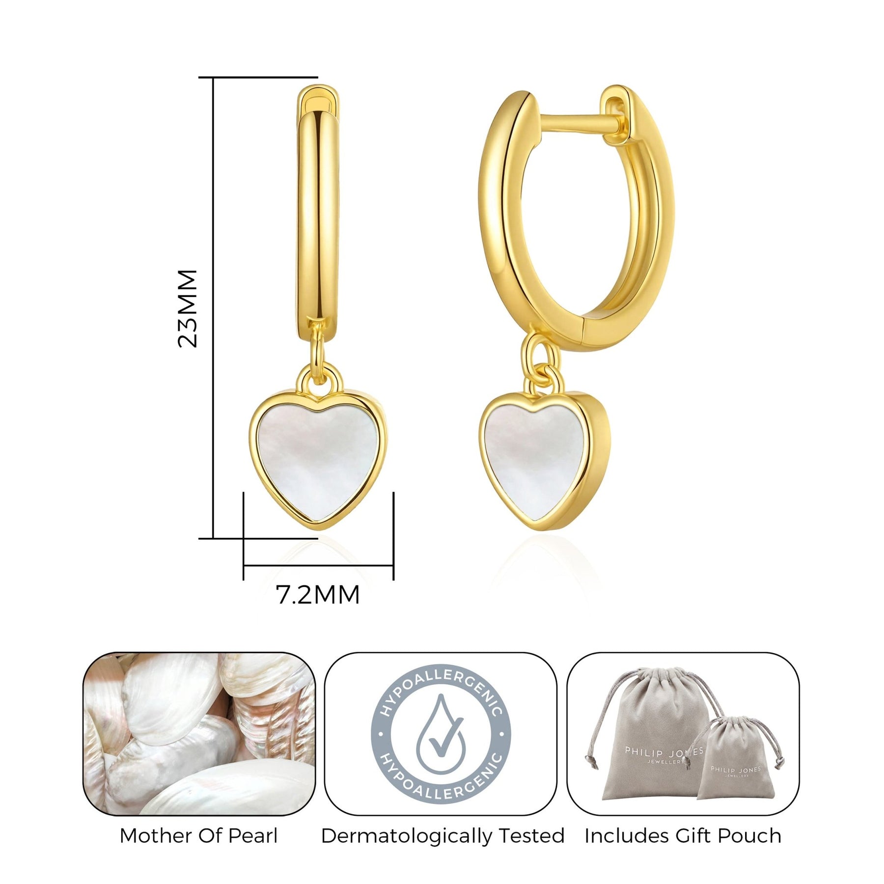 Featuring Mother of Pearl and 18k gold plating, these Philip Jones earrings offer both stunning style and hypoallergenic properties. The heart-shaped Mother of Pearl stones add a touch of elegance to your look, while the huggie closure ensures a secure and comfortable fit. These earrings come in a gift pouch making them the perfect gift for yourself or a loved one.