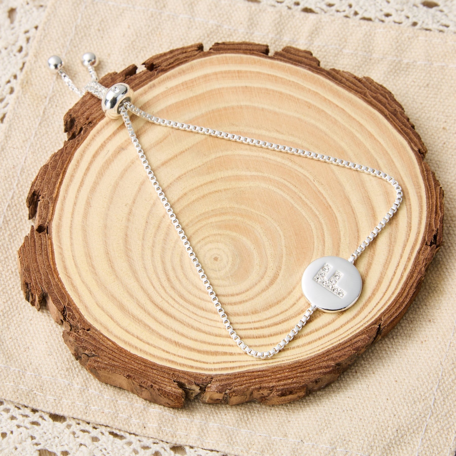Crafted with shimmering Zircondia® crystals, this adjustable Friendship Bracelet features the letter F as a meaningful centerpiece. Silver plated over a durable brass alloy base, it combines elegance with hypoallergenic comfort. The slider closure ensures a perfect fit from 12cm to 24cm, while the delicate circle adorned with clear crystals adds subtle sparkle. Presented in a stylish gift pouch, this bracelet makes a thoughtful and lasting symbol of connection.