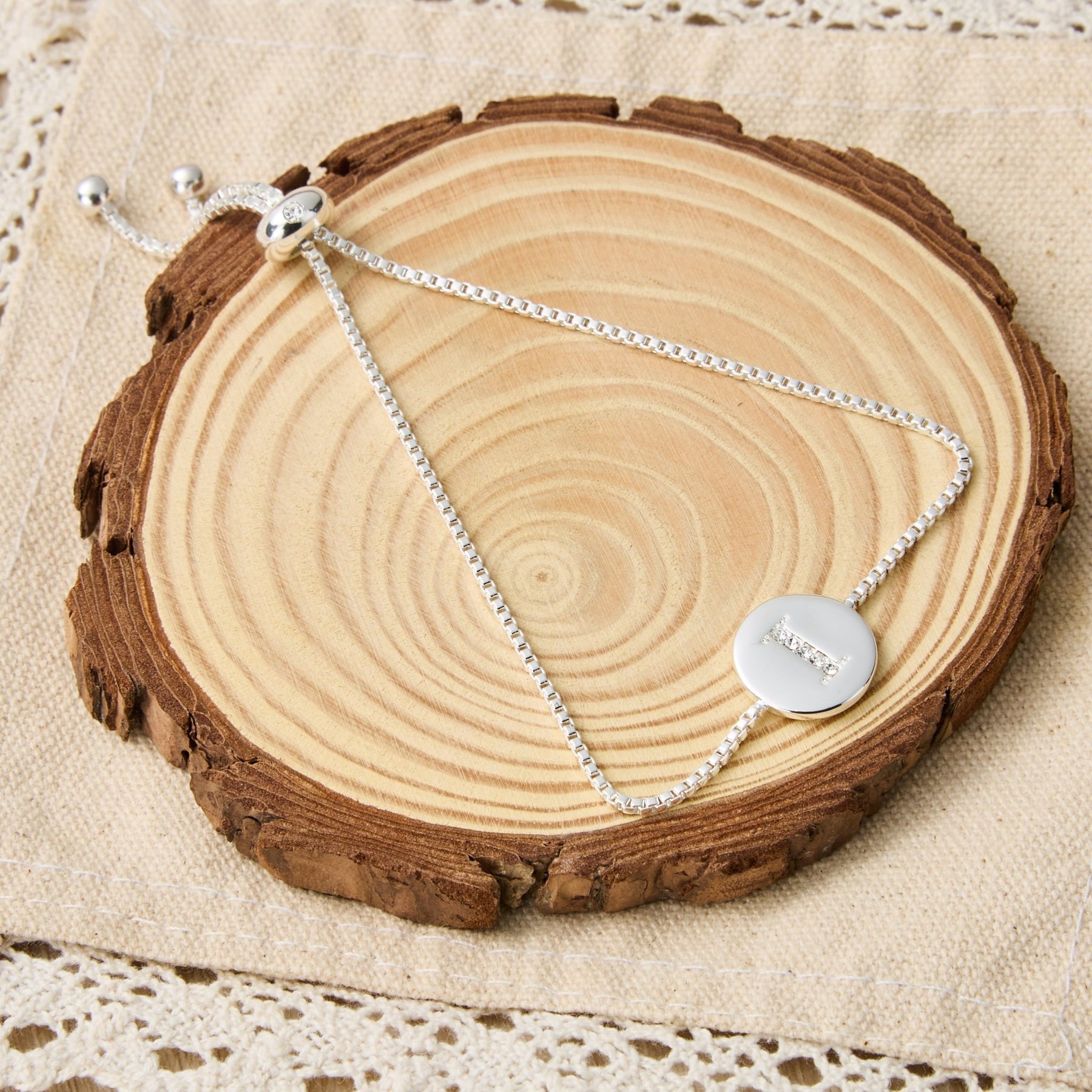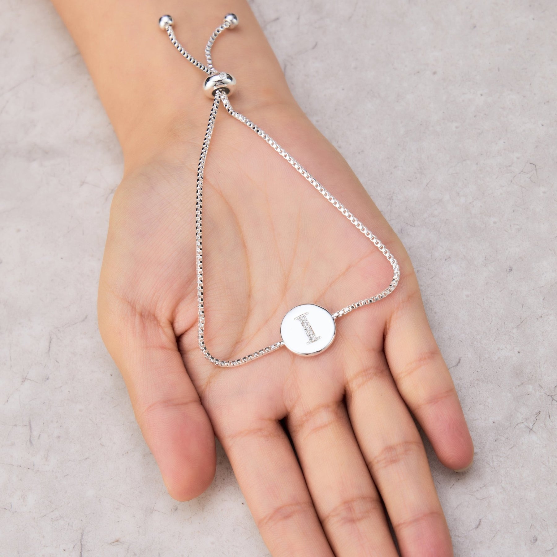 Celebrate friendship with this elegant Initial Friendship Bracelet featuring the letter "I," adorned with sparkling Zircondia® Crystals. Crafted from silver-plated brass alloy and designed to be hypoallergenic, it offers both style and comfort. The adjustable slider closure ensures a perfect fit between 12cm and 24cm, while the delicate circle charm measures 14.8mm in diameter. Presented in a beautiful gift pouch, this bracelet makes a thoughtful and meaningful gift for someone special. Lightweight and refined, it’s the ideal way to keep your friendship close every day.