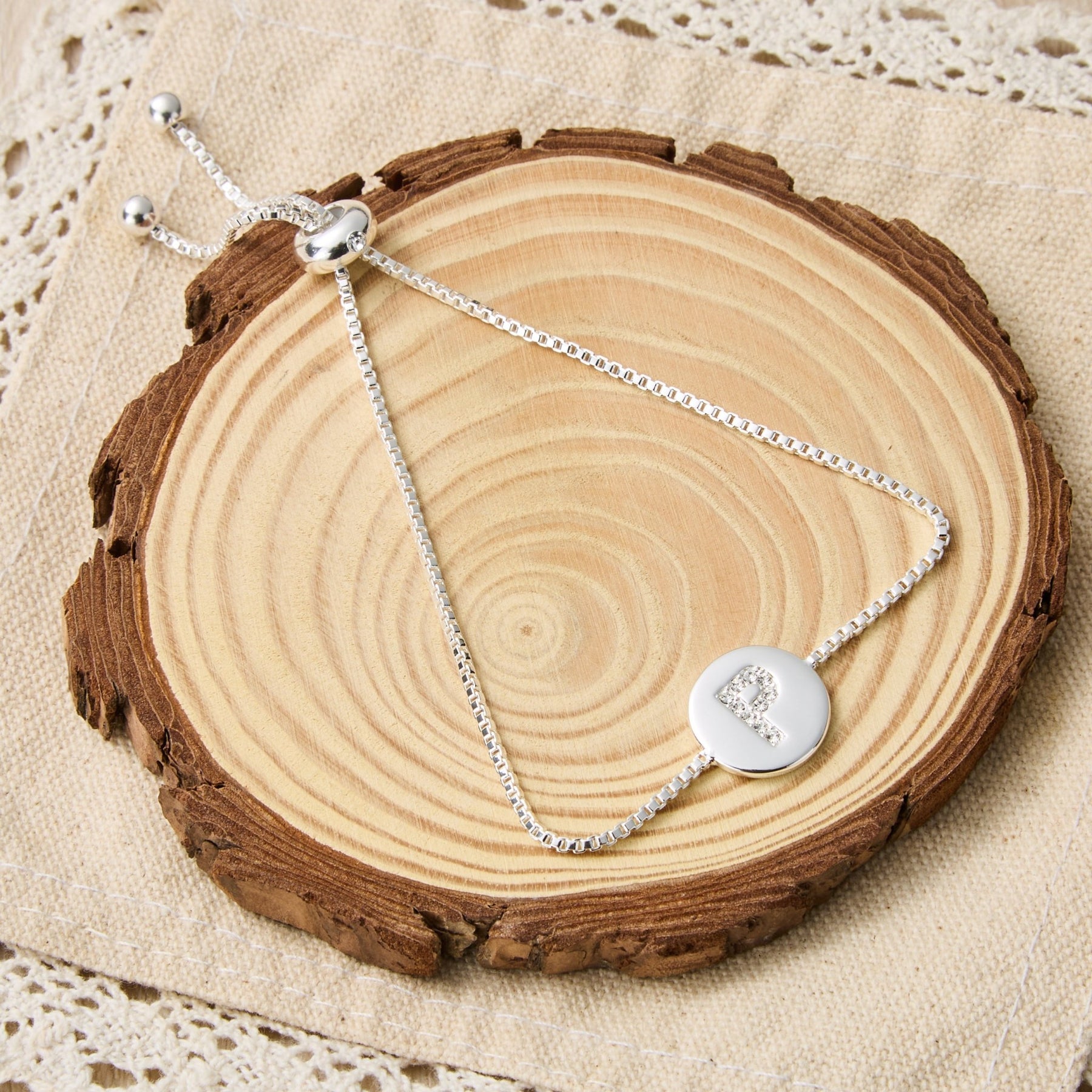 Celebrate any special occasion or moment with this adjustable Initial Friendship Bracelet from Philip Jones. Crafted with silver plated brass alloy, it features a 14.8mm round charm with a letter P on it and sparkling Zircondia® crystals in round and sizes of 1mm and 1.5mm. This beautiful bracelet is a perfect gift for your special someone.