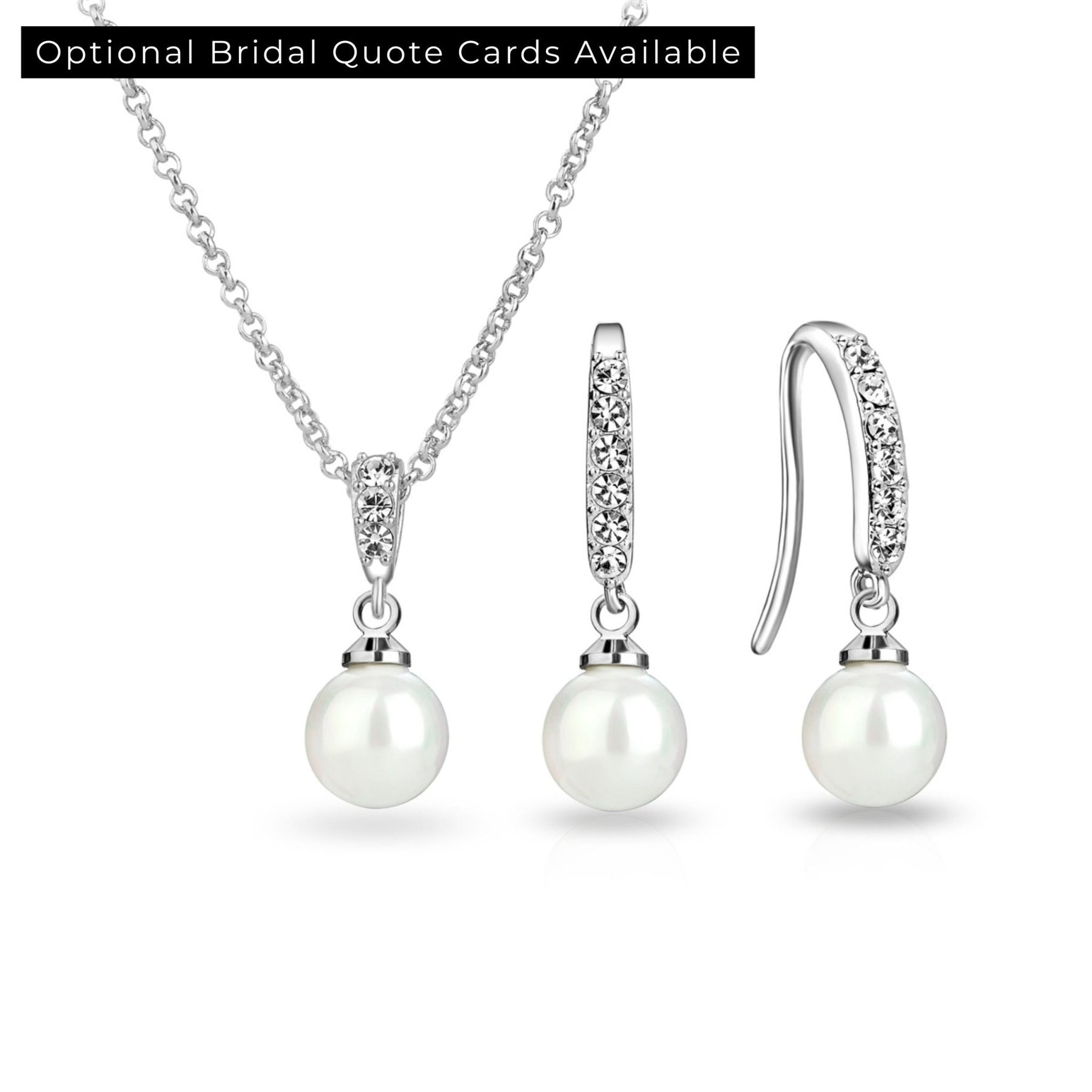 This stunning silver-plated bridal set by Philip Jones features Zircondia® crystals and white shell pearls, perfect for brides and bridesmaids. The drop earrings and pendant necklace offer sparkle and elegance, with hypoallergenic brass and secure closures. Weighing just 6.9g, the set is lightweight and comfortable for your wedding day. Presented in a gift pouch, it’s an ideal accessory to complete any bride or bridesmaid’s look.