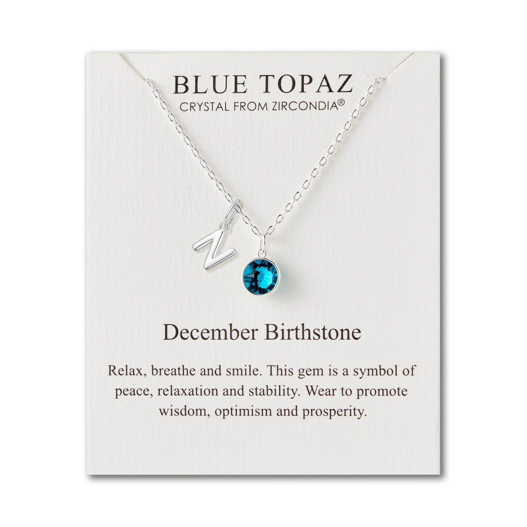 This december birthstone necklace features a stunning 8mm round blue topaz crystal from Zircondia®, set in a silver-plated pendant. Customise it with your choice of initial charm (A-Z) on a 43cm cable chain with a 5cm extender. Lightweight, hypoallergenic, and finished with a lobster claw clasp, it comes beautifully packaged in a gift pouch with a quote card—making it an ideal personalised gift.