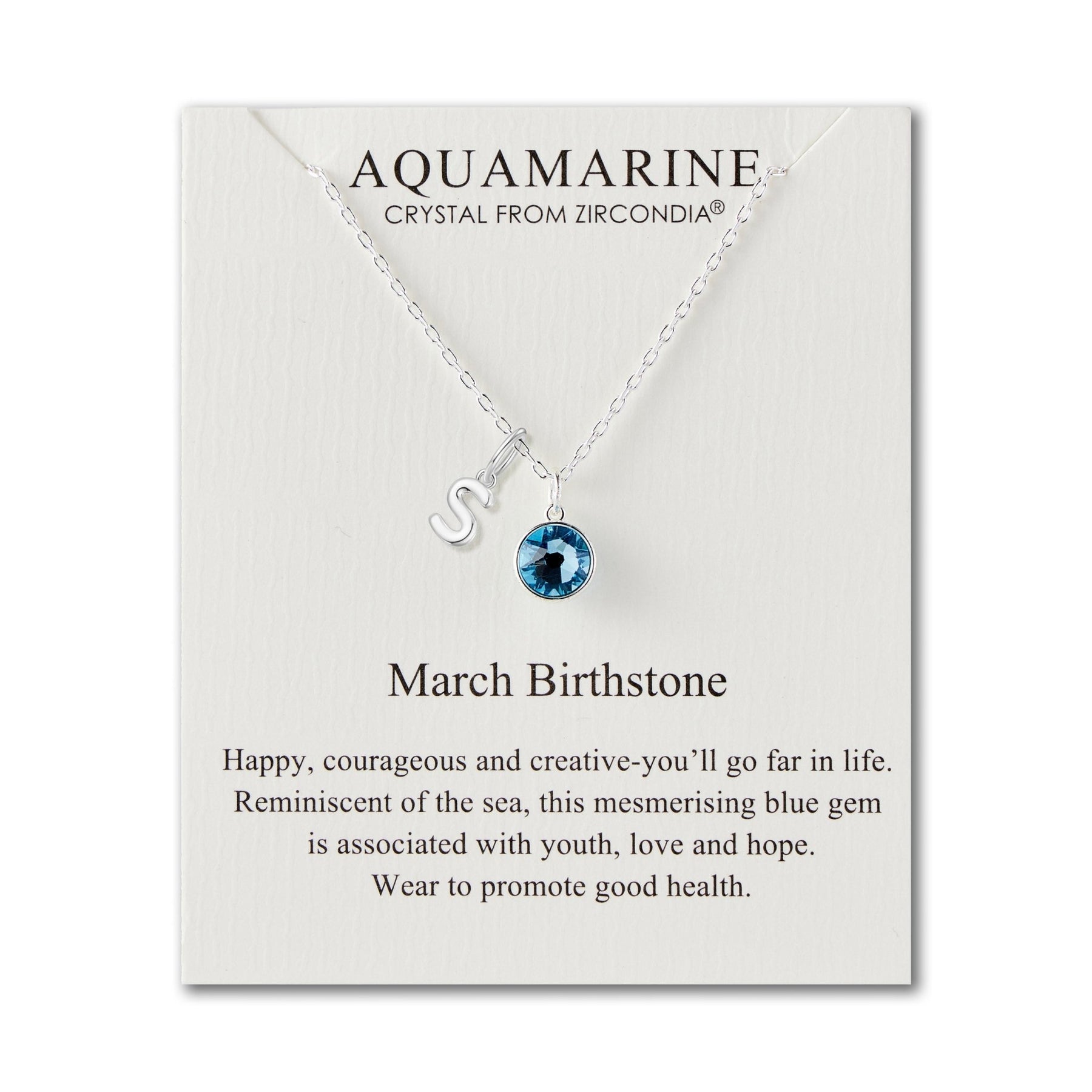 This march birthstone necklace features a stunning 8mm round aquamarine crystal from Zircondia®, set in a silver-plated pendant (14mm x 8.5mm). Customise it with your choice of initial charm (A-Z) on a 43cm cable chain with a 5cm extender. Lightweight, hypoallergenic, and finished with a lobster claw clasp, it comes beautifully packaged in a gift pouch with a quote card—making it an ideal personalised gift.