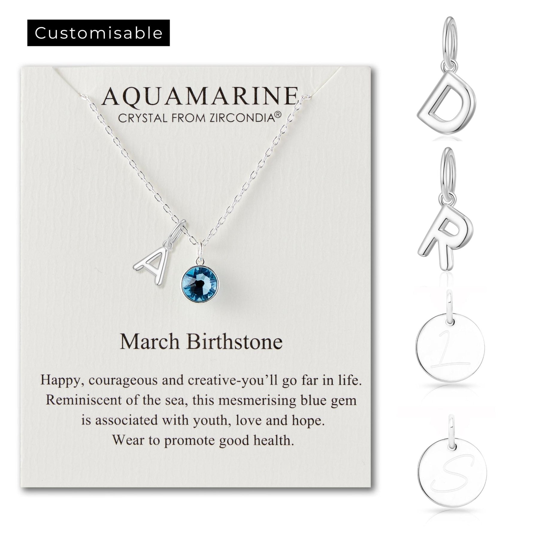 Customisable March (Aquamarine) Birthstone Necklace with Choice of Initial Charms (A-Z)