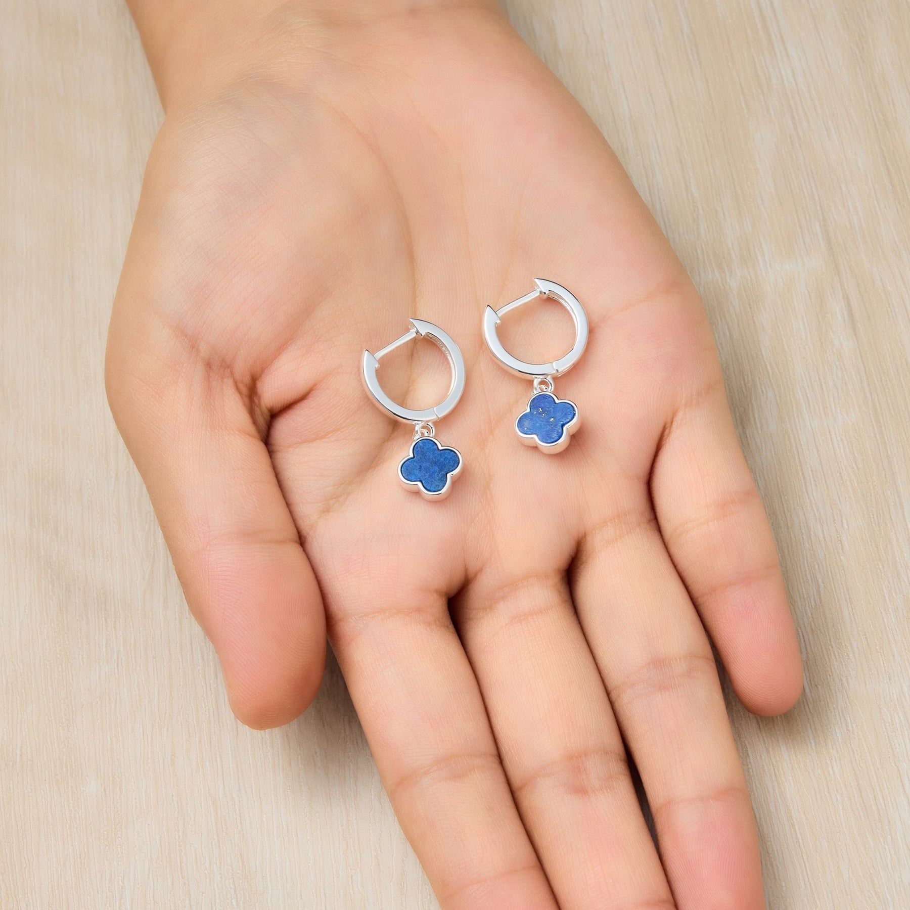 Lapis Gemstone Clover Charm Hoop Earrings
